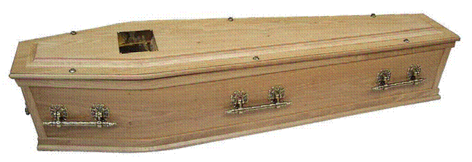 A Natural Finished Solid English Oak Coffin, craftsman made in Traditional Solid English Oak with Panelled Sides, Pillared and Tapered Ends, Chamfered Base Moulding and Raised Panel Lid. Beeswax Polished, mounted with three pairs of “Antique Brass” finished cast metal bar handles, finished with matching fittings and engraved inscription tablet. Lined, complete with superior interior coverlets, padded headrest and a facecloth.